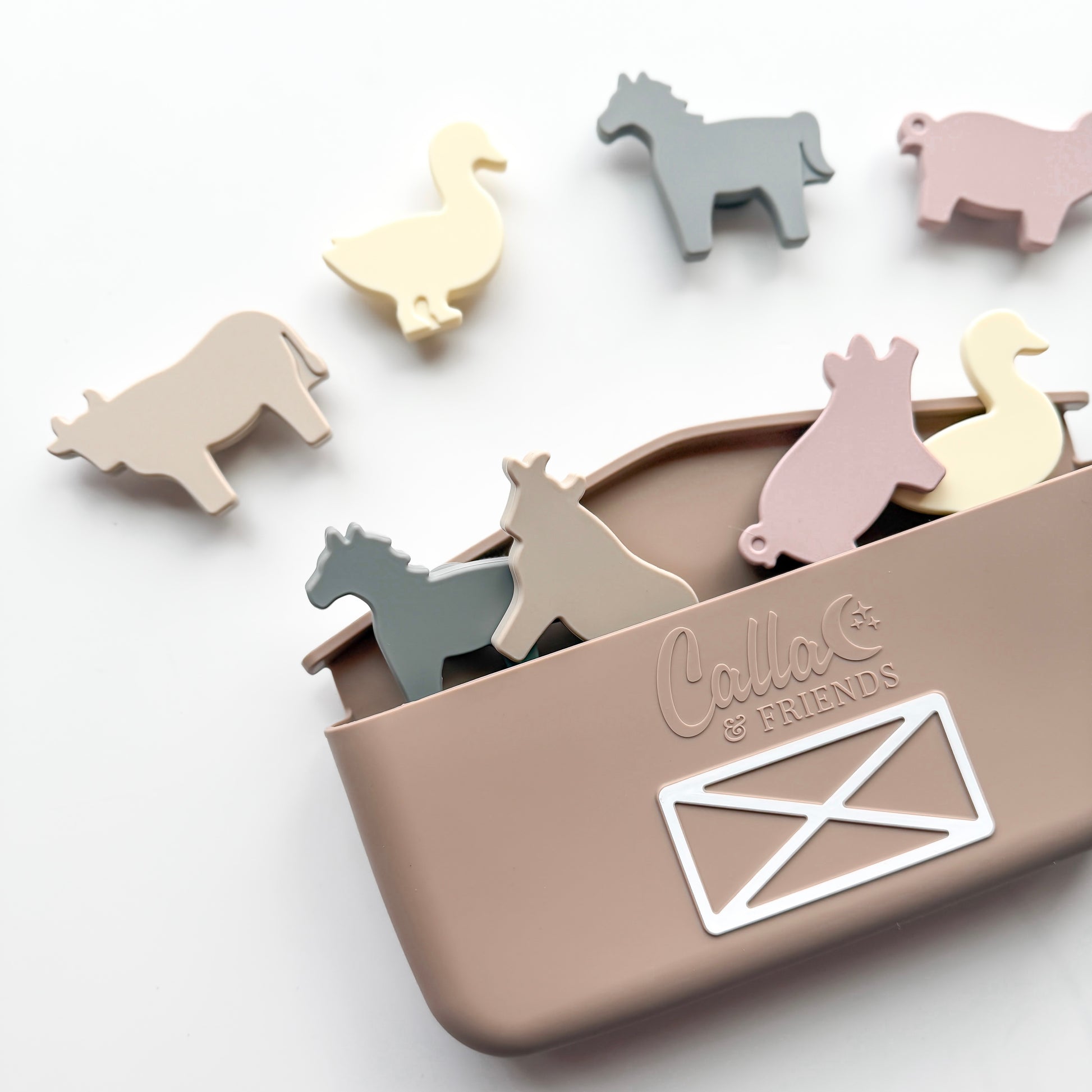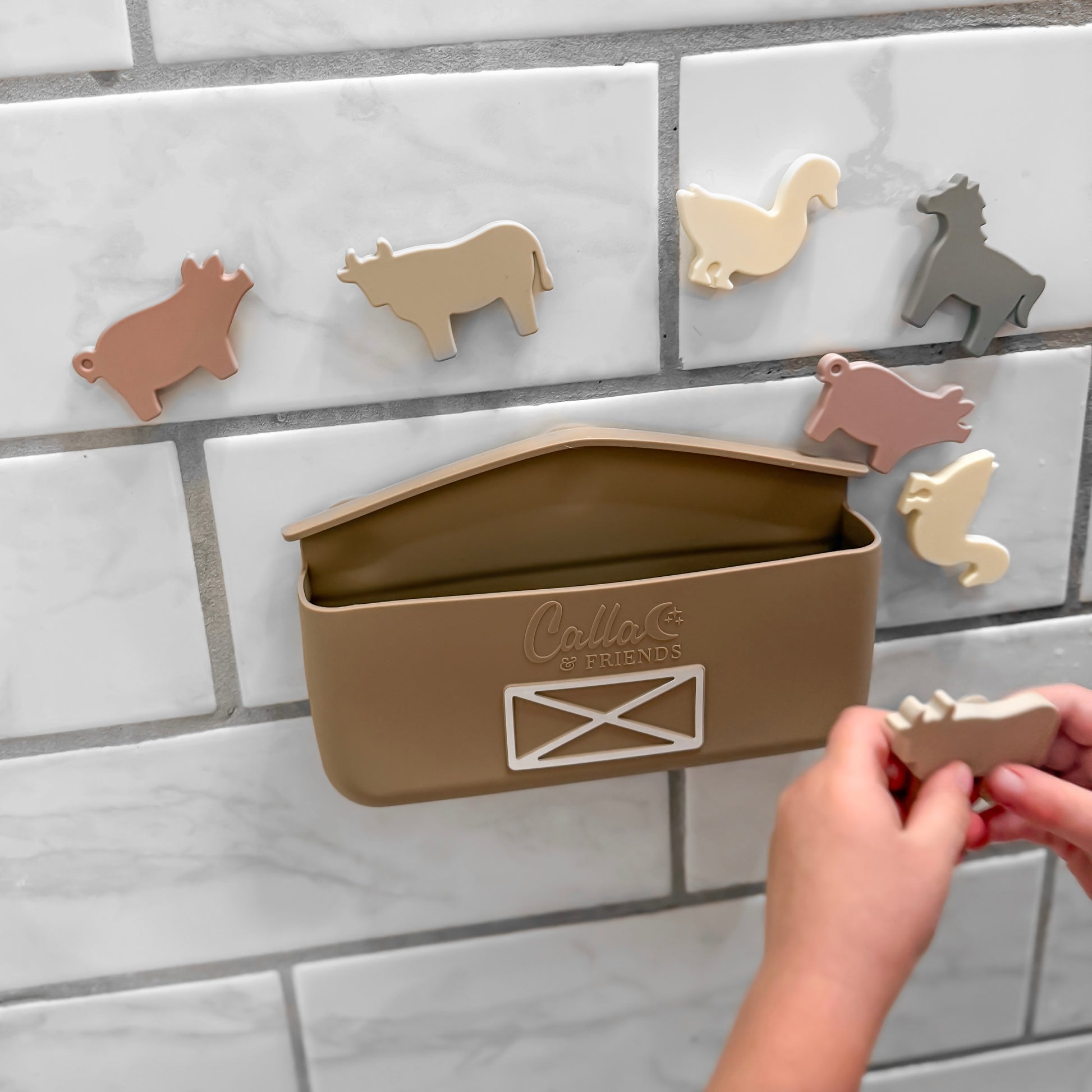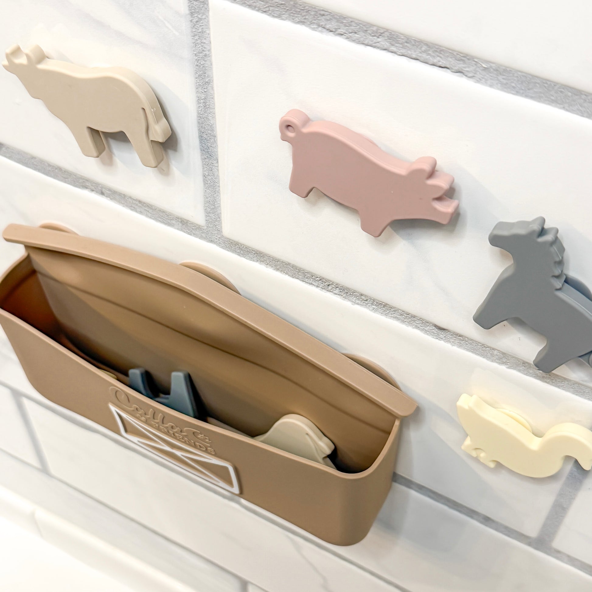 Bring farm fun to bath time, play time, and everything in between with our Farm Suction Toy Set! Designed to stick to tubs, fridges, windows, and more, these little farm friends spark imagination and keep curious hands busy. Made from non-toxic, food-grade silicone, they’re completely safe for little ones and dishwasher safe for easy cleanup. Each set comes packed in a reusable pouch so all your pieces stay together for play at home or on the go. Perfect for all your farm-loving kiddos!