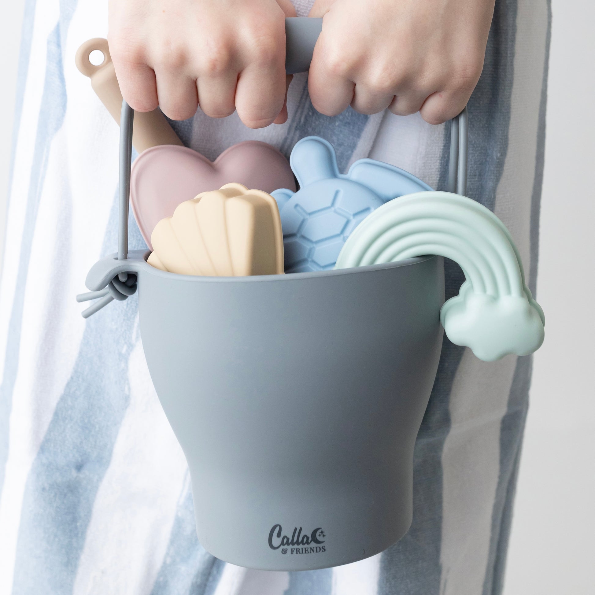 Each set includes: 1 bucket, 1 small shovel, 5 sand molds & an organic cotton storage bag